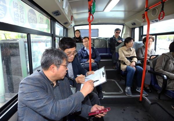 | ▲ 사진= 마을 버스에 직접 탑승해 여러가지 사항들을 점검하고있는 구 관계자들(사진제공=서초구청) | ||