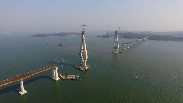 공정률 56%를 보이고 있는 해상교량은 주탑 2개와 교각 19개 위에 얹혀 해수면 30m 높이에 설치되고 있다.