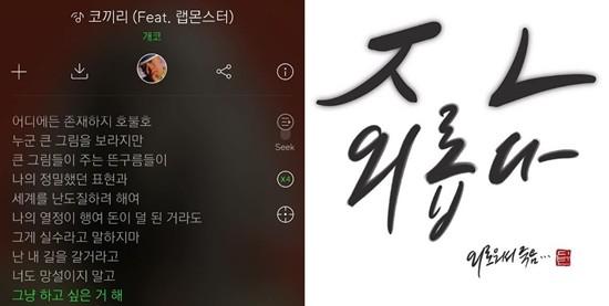 공개된 사진 속에는 개코의 ‘코끼리’ 가사 일부를 캡처한 것으로 ‘난 내 길을 갈거라고’ ‘너도 망설이지 말고’ ‘그냥 하고 싶은 거 해’라는 가사가 돋보인다.
