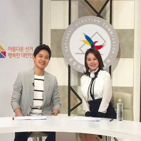 공개된 사진 속 김정근은 문지애 아나운서와 함께 선거 관련 프로그램을 진행하는 스튜디오에서 환하게 웃고 있다.