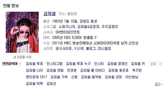 '김희철 투표'를 비롯해 한 포털사이트에 게재된 그의 연관검색어는 인스타그램, 키, 나이, 명단공개 2017, 학력, 군대, 아는형님 등이 있다.