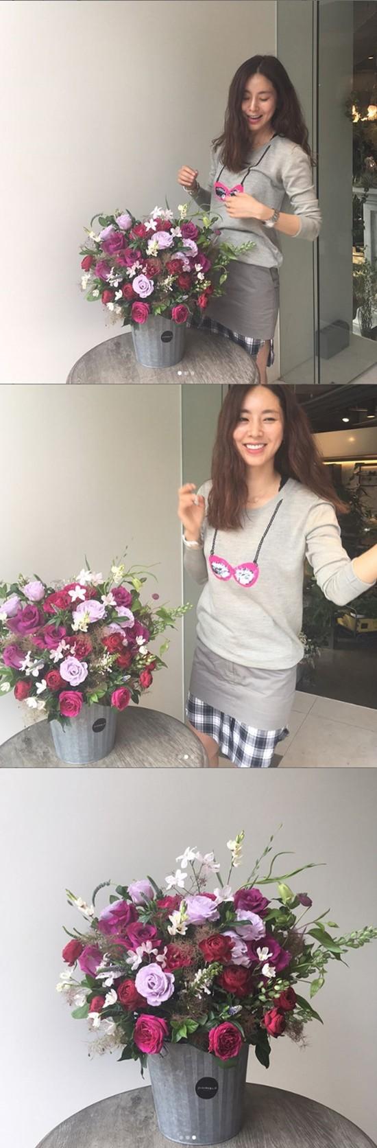 공개된 사진 중 두 장은 내추럴한 모습에 꽃 옆에서 환하게 웃고 있는 모습이며 마지막 한 장은 꽃다발을 정중앙에 둔 사진이다.