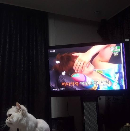 공개된 사진 속 이상민의 고양이는 어딘가를 바라보고 있는 모습이며 이와 함께 찍은 텔레비전은 ‘미운 우리 새끼’방송 전 광고 방송이 나오고 있는 모습이다.