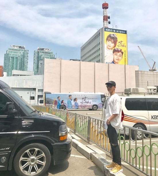 공개된 사진 속 그는 KBS 건물 벽면에 붙어있는 ‘쌈 마이웨이’포스터와 드라마 홍보용 버스 사이에서 절묘하게 서있는 모습이다.