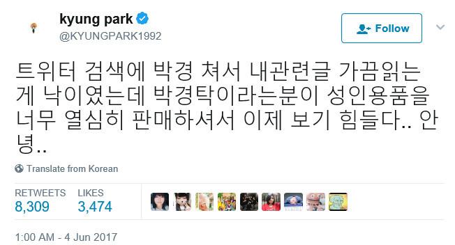 박경은 최근 자신의 SNS에 “트위터 검색에 박경 쳐서 내 관련글 가끔 읽는 게 낙이였는데 박경탁이라는 분이 성인용품을 너무 열심히 판매하셔서 이제 보기 힘들다.. 안녕..”라는 글을 게재했다.