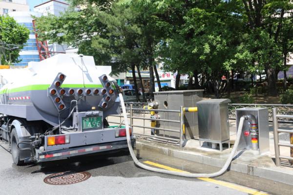 | ▲ 사진은 전력구에서 유출되는 지하수를 도로물청소 용수로 재활용하기 위해 물청소차량에 급수 작업을 하고 있는 모습.(사진제공=영등포구청) | ||