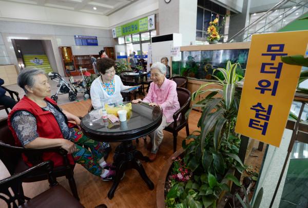 | ▲ 노인들이 구청1층로비 무더위쉼터에 모여 담소를 나누고 있다.(사진제공=동대문구청) | ||