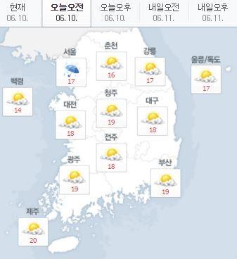 10일 오전 서울은 17도, 춘천 16도, 대구 18도, 대전 18도, 청주 19도, 부산 19도, 제주 20도를 기록 중이다.