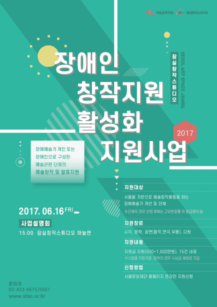 자세한 사항은 서울문화재단홈페이지 페이스북을 확인하면 되며, 사업 설명회는 16일 오후 3시잠실창작스튜디오 하늘연에서 열린다.