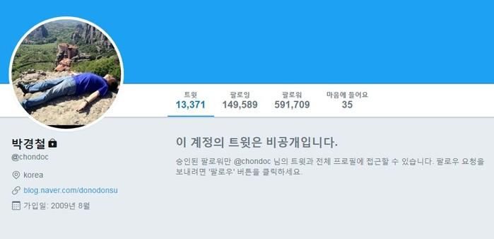 박경철의 트위터를 살펴보면, 현재 비공개 계정. 그의 팔로워수는 59만 1709명, 팔로잉수 14만 9589명이다. 트윗수는 13,371개로 활발한 활동을 펼친 것으로 보인다.
