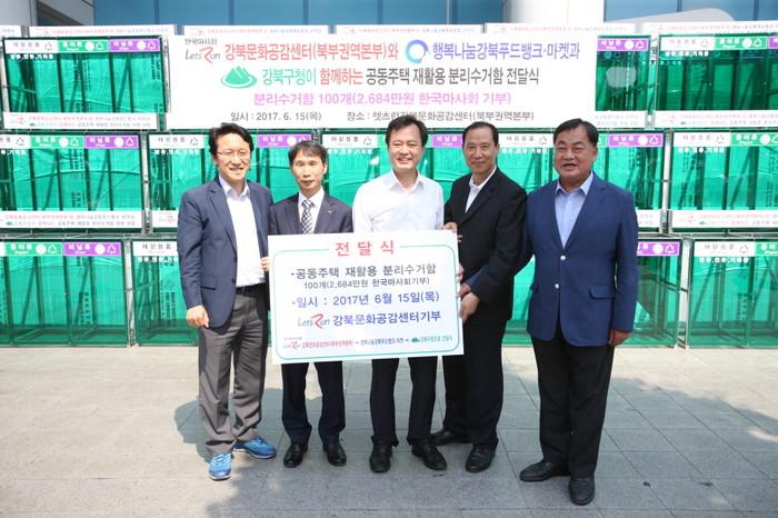 재활용 분리수거함은 행복나눔 강북푸드뱅크·마켓에 전달돼 지역내 13개동 주민센터로 배부되며, 공동주택의 쓰레기 무단투기 근절을 위해 설치될 예정이다.