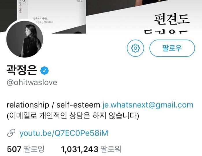 곽정은의 트위터 계정은 '@ohitwaslove'이며, 'relationship / self-esteem, (이메일로 개인적인 상담은 하지 않습니다)'라는 소개말이 적혀있다.