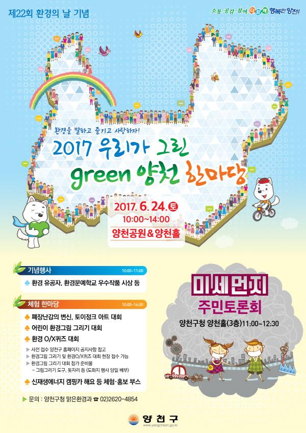 [시민일보=이대우 기자] 서울 양천구(구청장 김수영) 양천공원에서 ‘22회 세계환경의 날’을 기념해 24일 오전 10시부터 ‘2017 우리가 그린 green 양천 한마당’을 개최한다.