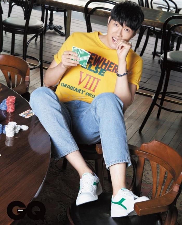 사진 속 지현우는 노란컬러의 셔츠에 데님팬츠 한손에는 카드를 들고 카메라를 바라보고 있다.