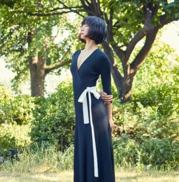 화보 속 배두나는 블랙컬러의 롱 드레스를 입고 눈을 감은 채 숲속에 서 있다.