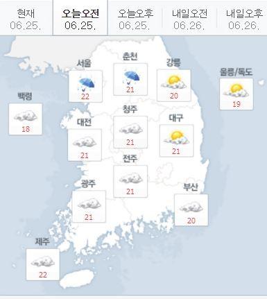 25일 현재 서울 22도, 춘천 21도, 대전 21도, 청주 21도, 전주 21도, 광주 21도, 부산 20도, 제주 22도를 기록 중이다.
