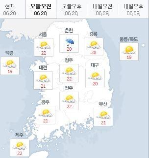 28일 현재 서울은 22도, 춘천 20도, 대전 21도, 대구 20도, 전주 22도, 광주 21도, 부산 21도, 제주 22도를 기록 중이다.