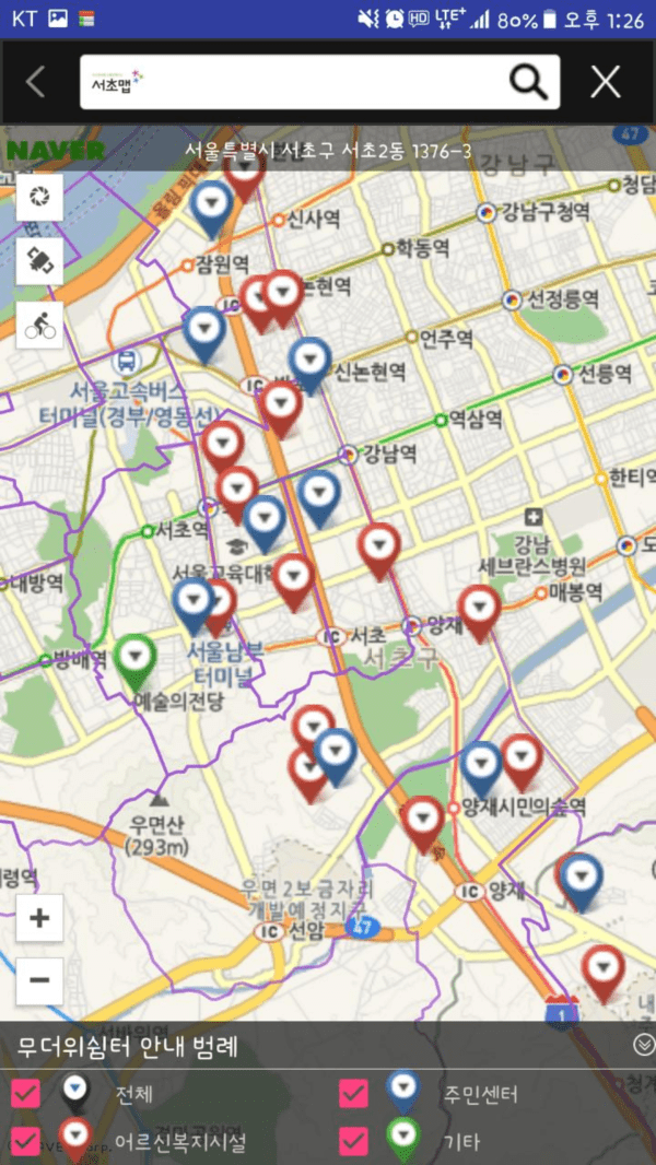 특히 ‘지도만들기’의 ‘서초공공지도’에서는 더위를 피할 수 있는 공공장소인 지역내 46개소의 무더위쉼터 위치를 안내하고 가장 가까운 무더위쉼터를 손쉽게 확인할 수 있으며, ‘누구나 지도생성’에서는 지도기반으로 간편하게 주변 유익한 정보를 서로 공유할 수 있어 많은 주민들이 유용하게 활용하고 있다.