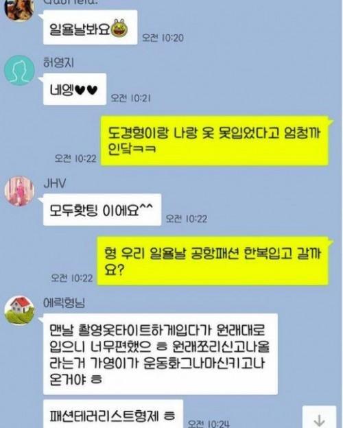 허정민은 “도경 형이랑 나랑 옷 못 입었다고 엄청 까인다”며 “형 우리 일욜날 공항패션 한복 입고 갈까요?”라고 물었다.
