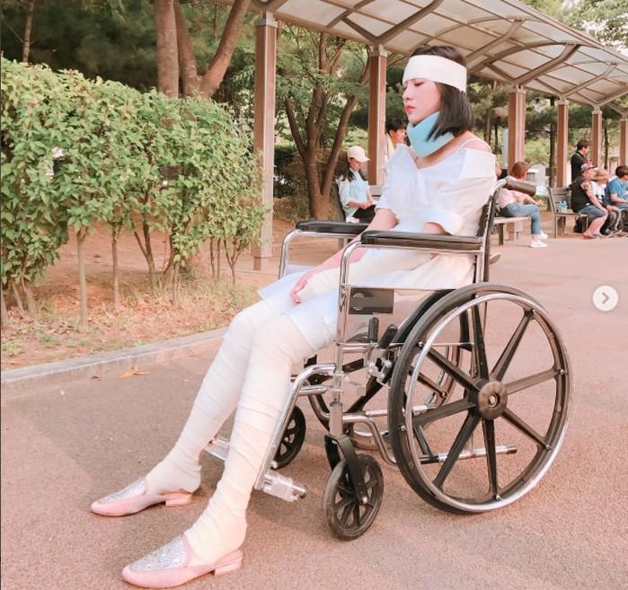 사진 속 그는 온 몸에 붕대를 감고 하얀색 원피스를 입고 있다. 특히 목 보호대와 머리붕대에도 하영의 눈부신 미모가 보는 이들의 눈길을 끌었다.