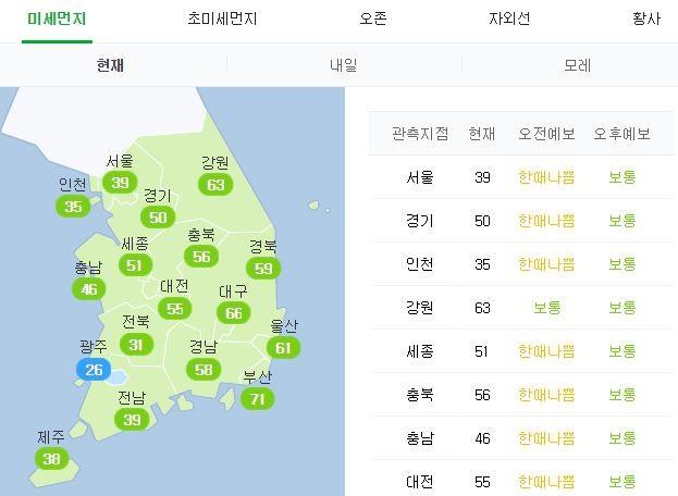 현재 서울, 인천, 기, 세종, 충북, 충남, 대전이 미세먼지 '나쁨' 주의를 받고 있다.
