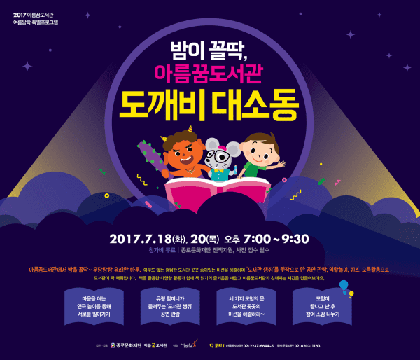 이번 프로그램은 밤이 되면 알 수 없는 발자국 소리가 들리는 아름꿈도서관의 비밀을 풀기 위해 동묘파출소에서 ‘어린이 수사대’를 모집하고, 어린이 수사대는 불꺼진 도서관을 탐험을 한다는 이야기로 진행된다.