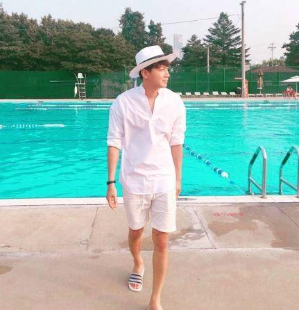 공개된 사진 속 그는 올 화이트로 무장한 페도라, 셔츠, 반바지를 갖춰입고 수영장 앞에서 워킹을 선보이고 있어 눈길을 끌었다.