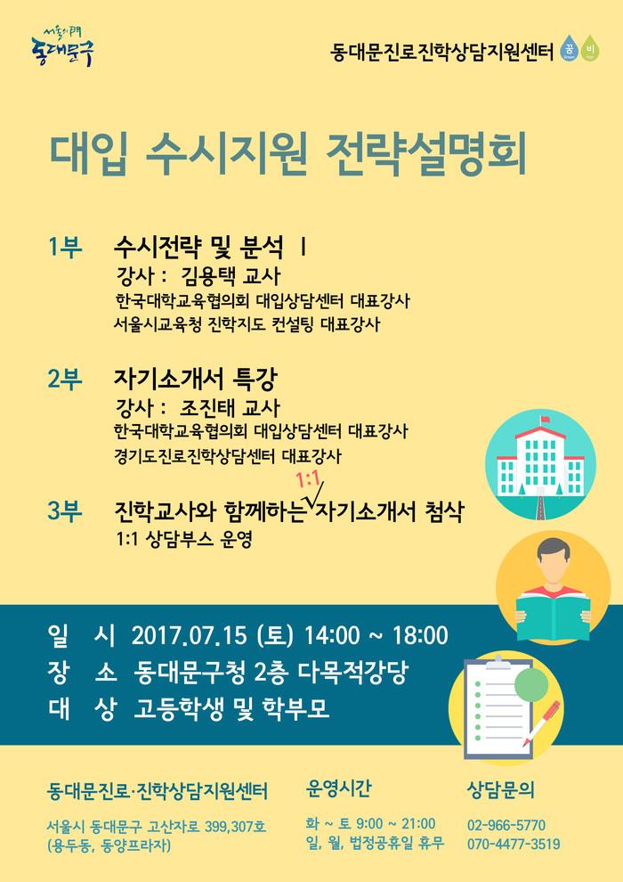 이날 설명화는 현직 고등학교 교사이자 한국대학교육협의회 대입상담센터 대표강사들이 ▲1부 수시지원 전략 및 분석 ▲2부 자기소개서 작성법 특강 ▲3부 자기소개서 첨삭지도로 나눠 진행한다.