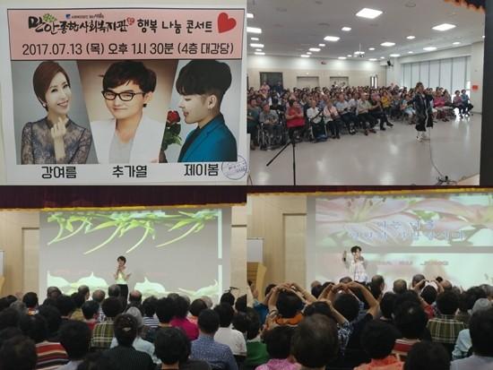 13일 안양 만안 종합 사회 복지관에서 열린 행복 나눔 콘서트에는 가수 추가열, 강여름, 제이봄이 재능 기부를 통해 어려운 이웃들에게 추억을 선물했다.