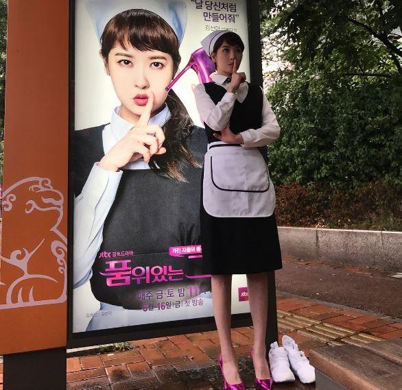 공개된 사진 속에는 '품위있는 그녀' 포스터 앞에서 포즈를 취하고 있는 그의 모습이 담겨있다. 특히 그는 '품위있는 그녀' 포스터 속 모습과 동일한 의상을 착용해 시선을 사로잡았다.