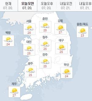 오전 서울은 25도, 춘천 25도, 대전 25도, 청주 25도, 대구 25도, 부산 24도, 제주 27도를 기록 중이다.