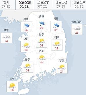 오전 서울은 26도, 춘천 26도, 대전 26도, 청주 26도, 전주 26도, 부산 27도, 제주 28도를 기록 중이다.