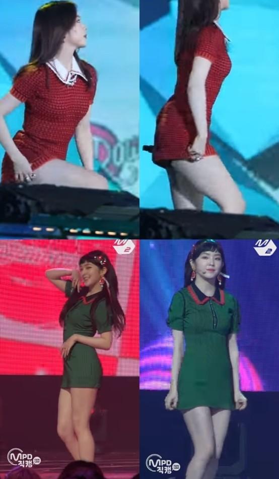 유투브 ‘MPD 직캠’ 채널에 공개된 레드벨벳의 ‘빨간 맛’ 무대 영상에는 아이린이 안무 도중 치마를 수차례 내리는 모습이 이어졌다. 아이린은 연두색 탑과 초록색 치마를 입었다.