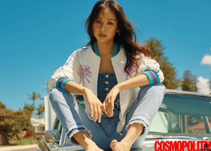 화보속 이효리는 긴 웨이브머리를 늘어뜨린 채 라이트 데님 팬츠와 튜브탑에 스카이블루가 배색된 화이트 컬러 점퍼를 입고 있다.