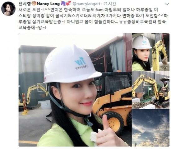 한편 낸시랭은 이날 자신의 트위터에 "새로운 도전. 굴삭기&스키로더& 지게차 3가지다 면허증 따기 도전함"이라며 "하루 종일 실기교육 받는 중~! 많이 덥고 몸이 힘들긴 하다. 중장비교육센터 합숙교육 중에~앙~!"이라는 글과 함께 굴삭기 합숙교육현장을 사진으로 찍어 공개하기도 했다.