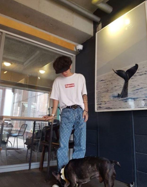 사진 속 해쉬스완은 흰티셔츠에 데님팬츠를 입고 돌고래가 그려진 그림앞에서 검은개한마리를 물끄러미 지켜보고 있다.