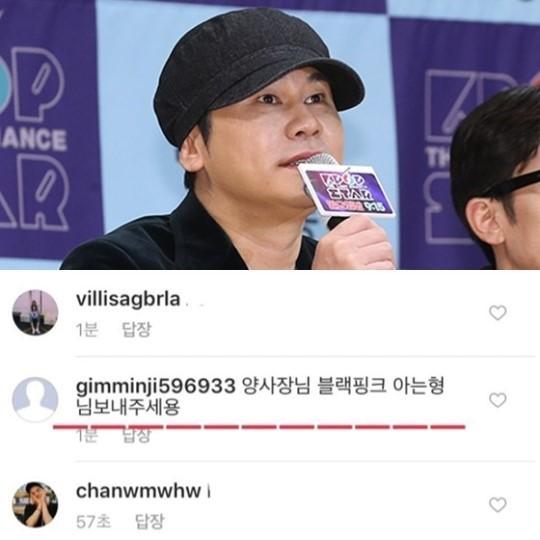 공개된 사진에는 한 네티즌이 ‘양사장님 블랙핑크 아는형님 보내주세용’이라는 댓글을 양현석이 캡처, 이를 표시한 한 내용이 담겼다.