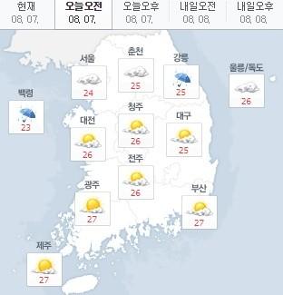 현재 서울은 24도, 춘천 25도, 대전 26도, 청주 26도, 대구 25도, 광주 27도, 부산 27도, 제주 27도를 기록 중이다.