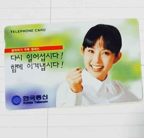 사진은 전화카드 모델 최진실이 활짝 웃으며 "다시 일어섭시다! 함께 이겨냅시다"란 글귀와 새겨져 있다. 생전 최진실의 건강한 이미지가 그대로 풍긴다.