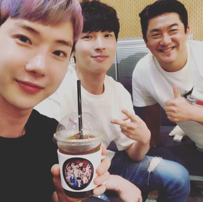 사진 속 조권은 블랙티셔츠에 아메리카노를 들고 박강현, 임철형과 함께 카메라를 바라보고 있다.