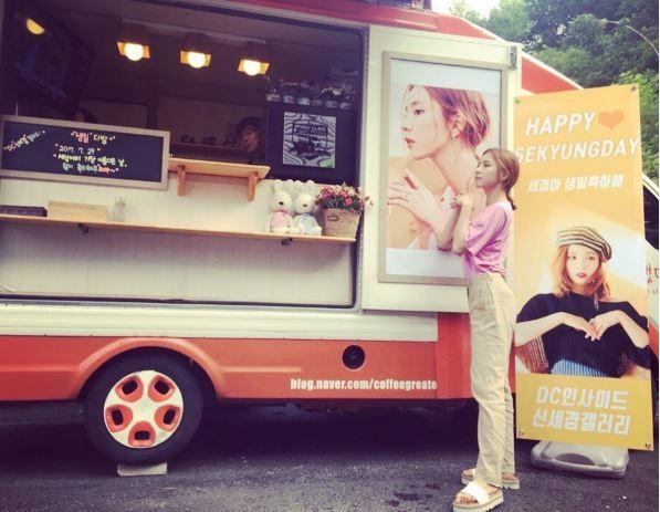 공개된 사진 속에는 커피차 앞에서 포즈를 취하고 있는 신세경의 모습이 담겨있다. 팬들이 신세경의 생일을 기념해 '하백의 신부' 촬영장에 커피차를 선물 한 것.