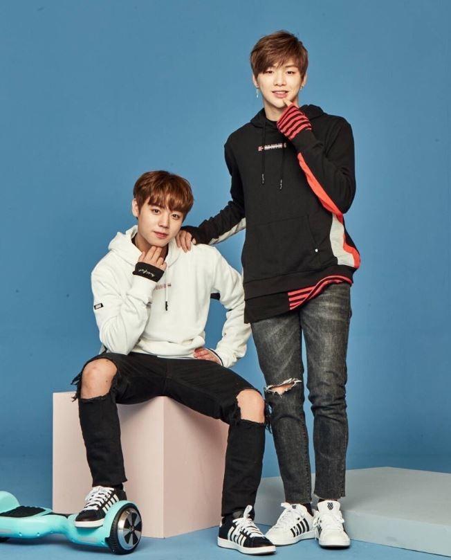 사진 속 둘은 모두 후드 셔츠차림이다. 박지훈은 화이트 후드티에 블랙 디스트로이드진을 입고 네모난 상자위에 앉아 있다. 강다니엘은 블랙 후드 티에 동일한 컬러의 찢어진 데님진을 착용했다.