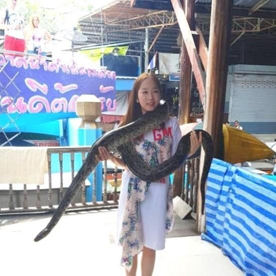 사진 속에는 한수민이 몸에 커다란 뱀을 감고 서있는 모습이다.