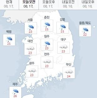 현재 서울은 23도, 춘천 21도, 대전 23도, 청주 23도, 대구 23도, 광주 23도, 부산 24도, 제주 26도를 기록 중이다.