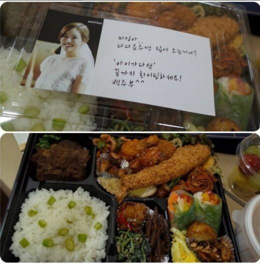 해당 사진은 백종원이 KBS2 드라마 ‘아이가 다섯’에 출연 중이던 소유진을 위해 팀 전체에 도시락을 선물한 것. 도시락 표면에는 “미정아, 다다음주면 집에 오는 거니? ‘아이가 다섯’ 끝까지 화이팅하세요! 백주부”라는 백종원의 달콤한 메시지가 게재되어 있다.