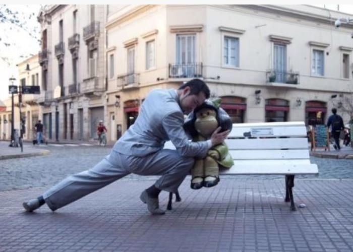 한걸음은 유럽의 어느 벤치에서 정장을 입고 벤치위에 놓여있는 인형을 감싸며 날렵한 탱고자세를 취하고 있다.