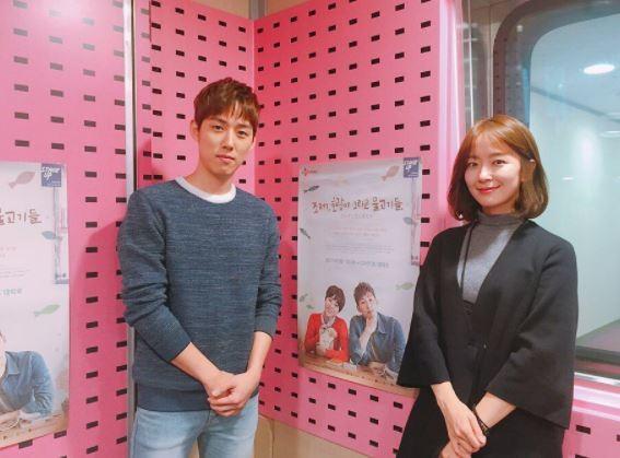 사진 속 백성현은 스웨터에 데님팬츠를 한 편안한 차림으로 숏팬츠에 트렌치 코트를 걸친 박선영아나운서와 함께 서있다.