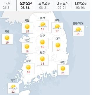 오늘 오전 서울은 15도, 춘천 13도, 대전 16도, 청주 16도, 대구 17도, 광주 18도, 부산 21도, 제주 22도를 기록 중이다.