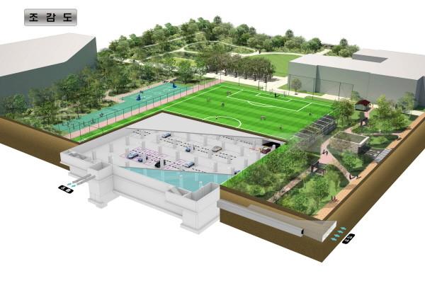 이번에 조성된 복합시설은 ▲지하 2층에 1만2800톤의 빗물을 담수하는 ‘빗물 저류조’, ▲지하 1층에 102면의 주차공간을 갖춘 ‘공영주차장’, ▲지상에 수목과 화훼류가 식재된 공원, 축구장과 농구장 등 ‘체육시설’로 배치돼 있다.