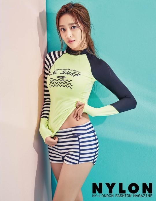 브랜드 엘르의 타이트한 래시가드와 핫팬츠, 워터 레깅스를 입고 카메라 앞에 선 조보아는 잘록한 허리와 늘씬한 다리로 탄탄한 보디라인을 자랑했다.
